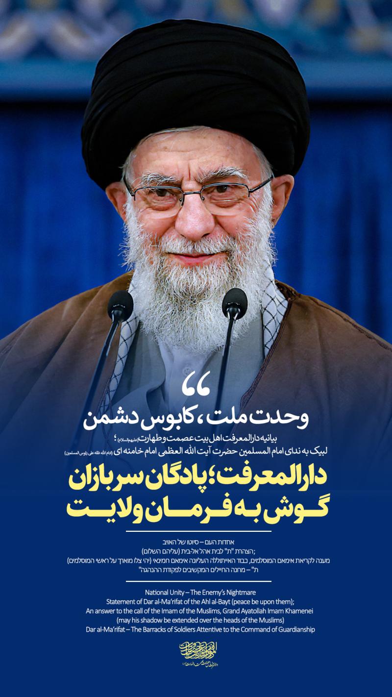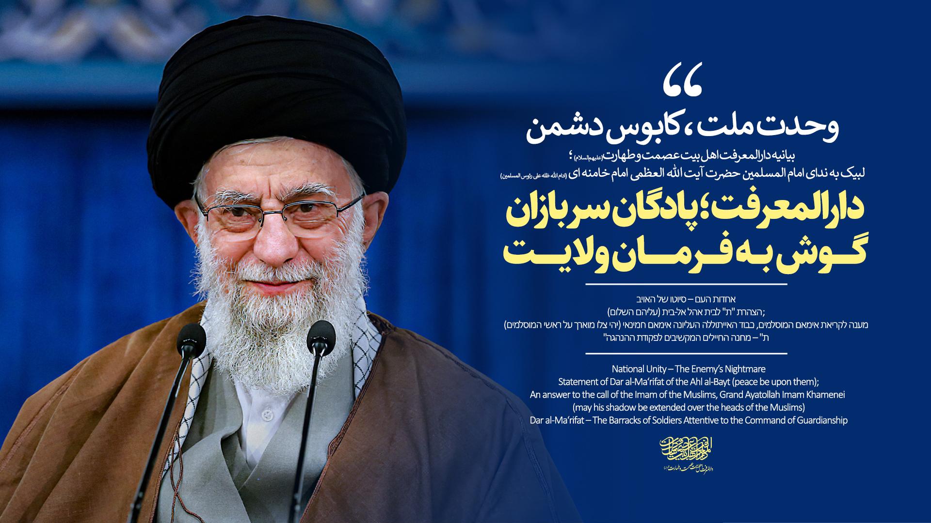 המנהיג העליון של המהפכה האסלאמית, האייתוללה הגדול אימאם ח’אמנאי (שישמר ה’ את רוממותו), בנאומו האחרון, בדברים חכמים ומוארים, שרטט את מפת הדרכים לכבוד ולעוצמה של האומה האיראנית. קהילת דאר אל־מערפה של אהלי אלבית (עליהם השלום) מכריזה בכל כולה כי דברים מוארים אלה אינם נאום בלבד, אלא 'ברית אלוהית, צו של המנהיג' ו־'מגילת חיים' להווה ולעתיד של הרפובליקה האסלאמית של איראן.