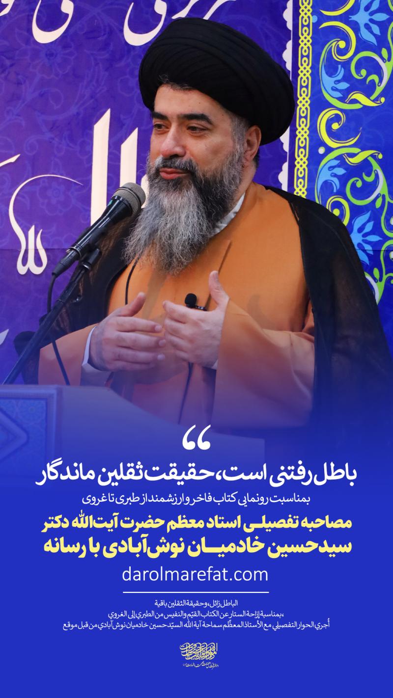 - به گزارش روابط عمومی و امور بینالملل نهاد دارالمعرفت اهل بیت عصمت و طهارت (علیهمالسلام) ، چندی پس از آیین رونمایی کتاب فاخر از طبــری تا غــروی و به همین مناسبت ، گفتوگویی تفصیلی با استاد معظم حضرت آیتالله دکتر سیدحسیــن خادمیان نوشآبادی ـ استاد برجسته حوزه و دانشگاه، عضو هیئت علمی و شورای عالی آموزش دارالمعرفت ـ توسط رسانه darolmarefat.com انجام گرفت. این گفتوگو به بازخوانی حقیقت تاریخ اسلام در پرتو قرآن و عترت اختصاص داشت ؛ متن این مصاحبه به حضور معارف بخشتان تقدیم میگردد.