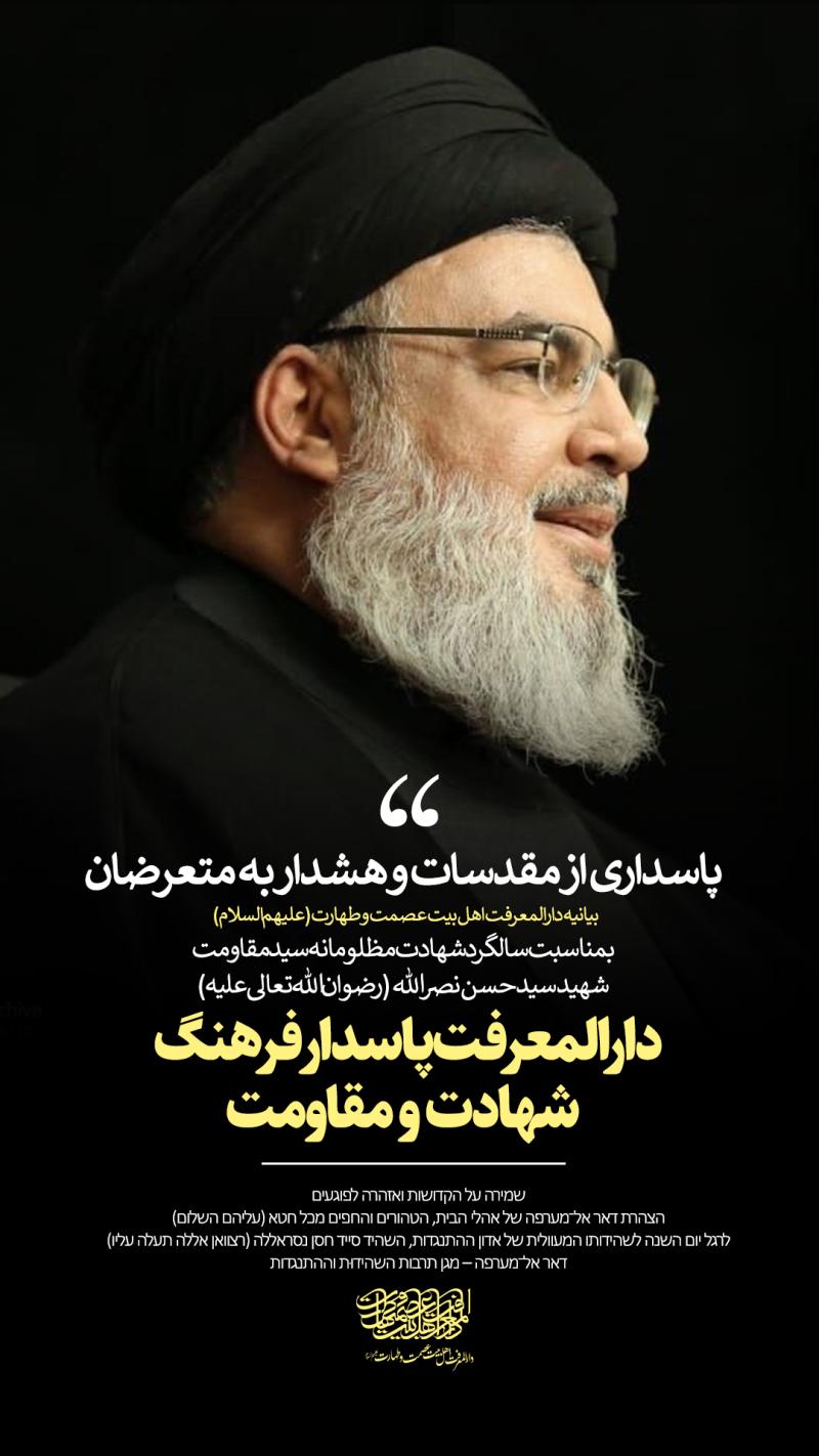 - לדיווח יחסי הציבור והקשרים הבינלאומיים של הגוף התרבותי־מהפכני נָהַד (נְהָאד) דַאר־אל־מַעְרִיפַת עַאֶל־בֵּית עַסְמַת וְטַהַרה (עֲלֵיהֶם־אֶסְסַלַאם), עם הגיע מועד יום השנה לרציחתו הנאמנה והמגונה של מגדלורי ההתנגדות — המהגדול במנהיגיו, מר א־שייח' סיד חסן נסראללה — הוציא ארגון זה הודעה רשמית כדי לכבד את זכרו של המנהיג הנצור ולהבהיר את עמדותיו כלפי פשע הממשל הציוני הרשעה.