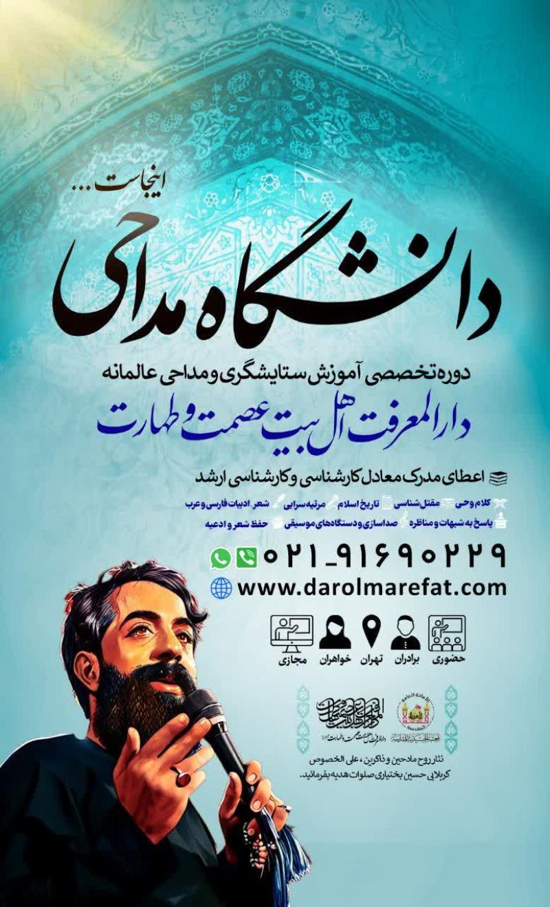 ثبت نام چهل و سومیــن دوره تخصصی آموزشی ستایشـگری و مداحی سال 1404 ویژه برادران و خواهران آغاز شد. علاقمندان میتوانند جهت اطلاع از شرایط دوره ، شهریه و اساتید معظم ، صوت توضیــحات را با دقت استماع و پس از آن نسبت به نام نویسی و پرداخت شهریه از طریق لینک زیر به صورت آنلاین اقدام به ثبت نام کنند.